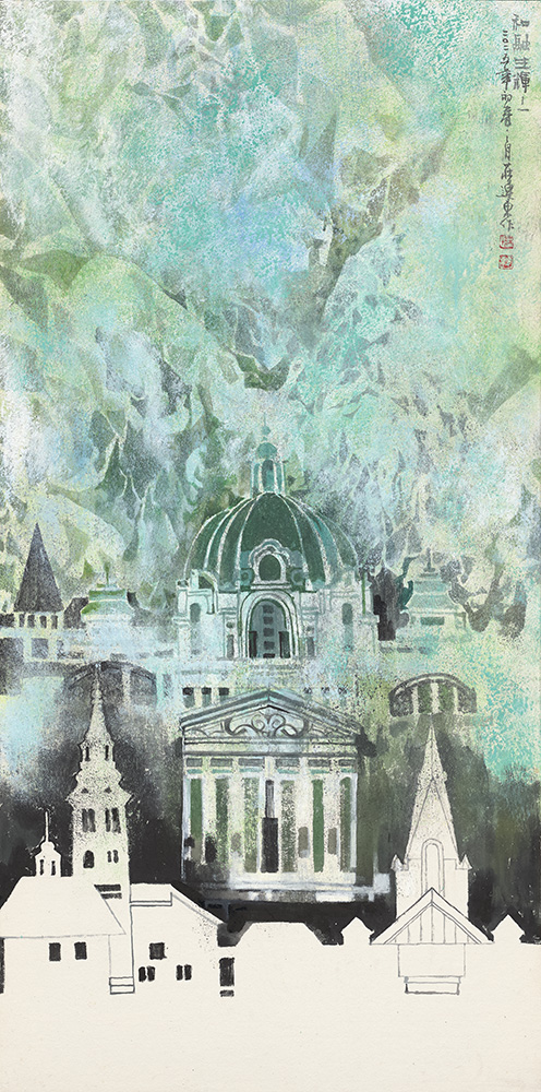 〈消融與幻化--和融生輝-1〉,2025 ,繪 、拍、墨、彩、GESSO、紙,140x70cm。大圖